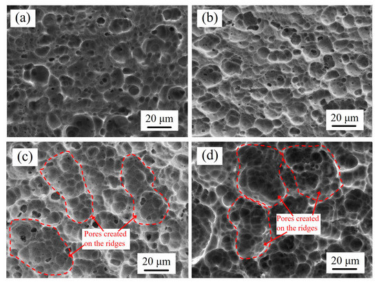 In order to generate different surface roughness levels on the Al-Li substrates, four different PAA processes were applied, as presented in Table 3. Sandpaper and sandblasting were used as the first pre-treatment to create surfaces of different roughness, these were then treated by PAA. The combined treatment generates surfaces with similar porous structures and different roughness levels, as shown in Figure 7. The rough surfaces with numerous ridges created by sandblasting increase the actual area involved in the anodization reaction, which enables the formation of increased microporous structures, as shown in Figure 7c,d. The actual area for the anodization reaction is smaller for the samples pre-treated by sandpaper abrasion, as shown in Figure 7a,b. The treated surfaces and their roughness values (Ra) are shown in Figure 8. As demonstrated, the roughness values of the samples treated with processes 1 and 2 are small at 0.85 and 1.45 μm, respectively, while the samples treated with processes 3 and 4 have larger roughness values of 2.85 and 4.21 μm, respectively.