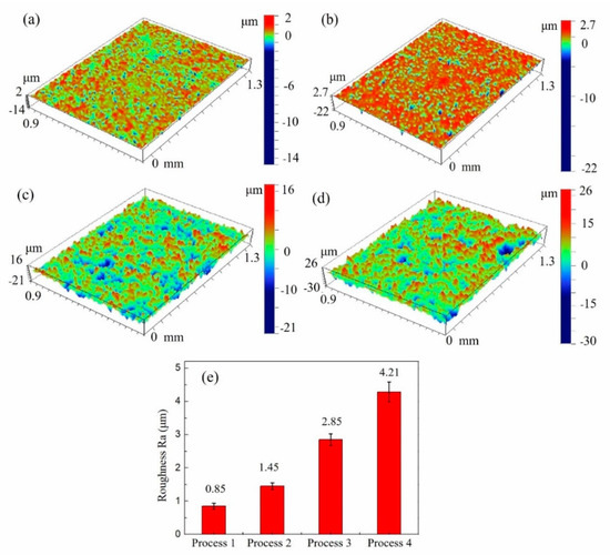 Profilometry of rough surfaces created by combined methods: (a) process 1, (b) process 2, (c) process 3, (d) process 4, and (e) values of Ra.