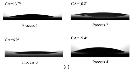 Substrates treated with combined methods: (a) process 1, (b) process 2, (c) process 3, and (d) process 4.