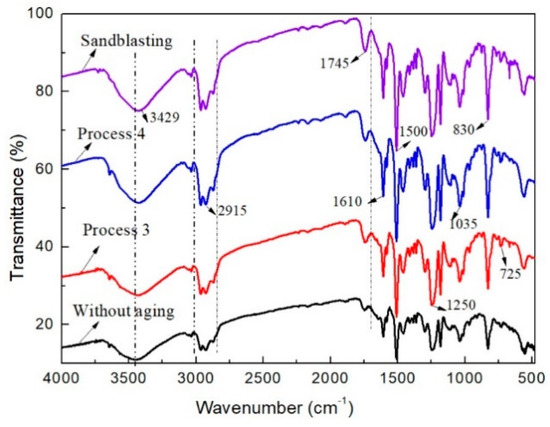 To understand the influence of hot-humid exposure on the adhesive properties, FM 94 adhesive was removed from the aged joints and analyzed by FTIR. The FTIR spectrums of aged and unaged adhesive are shown in Figure 12. From the image it can be found that the spectrums of aged and unaged adhesive are very similar; the main peaks appear at around the 2915 and 3430 cm−1 regions, especially in the zone from 725 to 1610 cm−1. Obvious movement of the peaks on the spectrums was not observed, and no new peaks appear on the curves, which indicates that the hot-humid exposure had little influence on the adhesive properties in this experiment. The reduction of the joint strength is mainly attributed to the degradation of the bonding adhesion between the adhesive and substrates. Therefore, the degradation of bonding adhesion is responsible for the reduction of strength under the exposure and will be analyzed next.