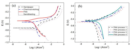 Polarization curves of Al−Li substrates created by (a) different surface treatments and (b) phosphoric acid anodization (PAA) on substrates of different roughnesses.