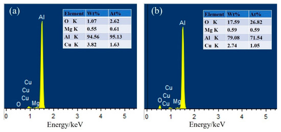 To study the corrosion resistances of Al-Li substrates with different surface characteristics, the polarization curves of different substrates are measured, as shown in Figure 13. The corrosion potentials and corrosion current densities, presented in Table 5 and Table 6, are used to analyze the corrosion tendency and corrosion rate of the substrates. The polarization curves of Figure 13a are compared to study the corrosion resistances of substrates with the four different surface treatment processes. The curves show significant differences in corrosion resistance among the substrates. Table 6 presents the corrosion information corresponding to the curves of Figure 13a. The PAA-treated substrate shows the smallest current density value, which means that its corrosion resistance is superior to those of the other treatments. The different corrosion properties of the substrates are primarily attributable to the surface chemical compositions produced by the different treatments. The oxide layer created by PAA on the surface can physically protect the Al-Li substrate and thereby reduce the corrosion rate. However, for sandpaper, sandblasting, and chemical etching in CuCl2 solution, although the surface topographies change, no oxide layers form on the surfaces and the bare aluminum is easily corroded. The EDS results of the oxygen contents of the sandpaper and PAA treated surfaces are shown in Figure 14; the oxygen content of the PAA-treated surface is significantly higher than that of the sandpaper abraded surface. Figure 13b shows the polarization curves of substrates treated with different combined PAA/mechanical methods; the curves are similar. Table 6 presents the corrosion information corresponding to the curves of Figure 13b. The current densities are similar, indicating similar corrosion resistances of the substrates. The corrosion information and strength degradation data presented in Table 5 and Table 6 show that substrates with good corrosion resistance exhibit good durability; however, the current density trends are not completely consistent with the strength degradation trends, which indicates that the durability is also related to the characteristics of bonding interfaces between the adhesive and substrates.