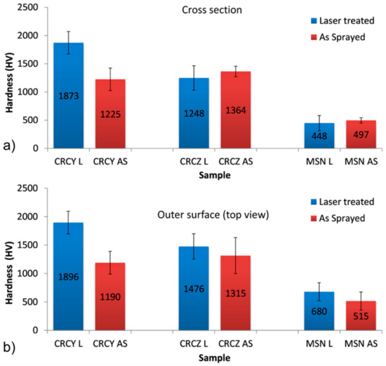 Microhardness of the as-sprayed (AS) and laser-treated (L) samples measured on the cross-section (a) and the top surface (b) (error bars indicate +/− standard deviation).