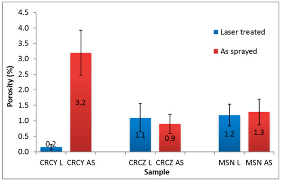 Porosity of the as-sprayed (AS) and laser-treated (L) samples. (error bars indicate +/− standard deviation).
