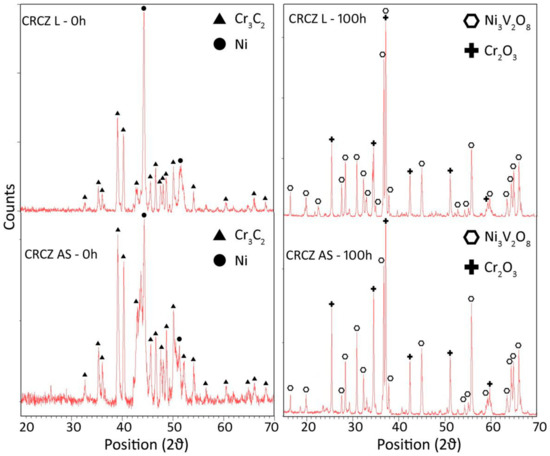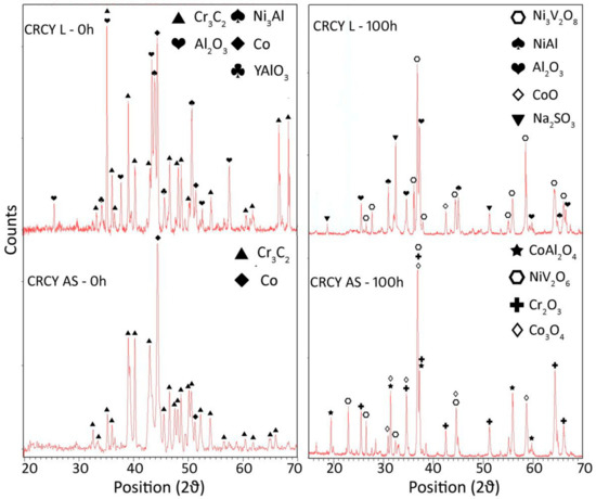 XRD patterns for the CRCY samples: AS—as-sprayed (lower left); L—laser-treated (upper left); AS-100 h—as-sprayed, exposed for 100 h (lower right); L-100h—laser-treated, exposed for 100 h (upper right).