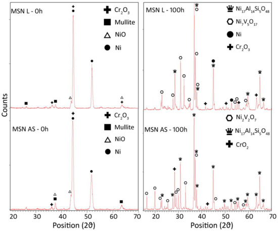 XRD patterns for the MSN samples: AS—as-sprayed (lower left); L—laser-treated (upper left); AS-100 h—as-sprayed, exposed for 100 h (lower right); L-100h—laser-treated, exposed for 100 h (upper right).