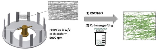 As cellular microenvironments play a relevant role in cellular function, mimicking the physical and chemical properties of native extracellular matrices is a useful approach to regulate cell behaviour. A key factor in tissue engineering and regenerative medicine is the design and manufacture of biocompatible and biodegradable constructs. PHBV is a promising biodegradable and non-antigenic biopolymer, as low molecular weight PHB is present in biological cells. Although this biopolymer (and monomers and oligomers) has been shown to be an excellent candidate biomaterial for tissue engineering [], similar work on nerve and skin tissue engineering have shown improved surface properties and cellular behaviour on collagen-coated nanofibers [,,]. Collagen is a key component of the extracellular matrix present in nearly every tissue in the human body; thus it’s grafting to a base polymer has been shown to increase the adhesion and proliferation of cells onto polymeric scaffolds [], making collagen functionalisation treatment an attractive practice for enhancing the biological performance of a material.