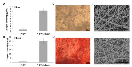 Quantification of collagen content by Sirius Red Assay in (A). PHBV films (ug of collagen per area) and 3D fibrous mesh fabricated by forcespinning (ug of collagen per mass of fibres) (B). Microscopy of 3D fibrous PHBV mesh stained with Sirus Red (C) before, and (D) after, collagen functionalisation. SEM image of fabricated scaffolds by forcespinning (E) before, and (F) after collagen grafting. Scale bar in SEM corresponds to 100 μm.