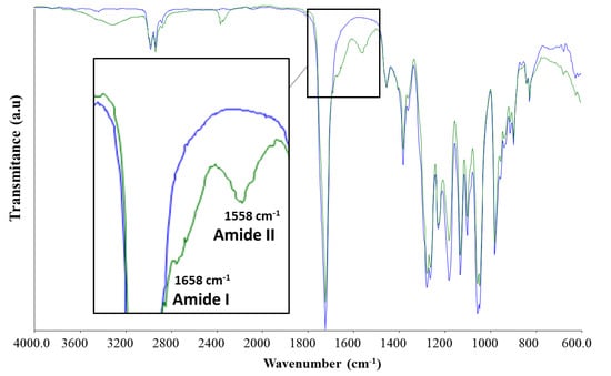 ATR-FTIR analysis of unconjugated (blue) and conjugated (green) fibrous scaffolds.