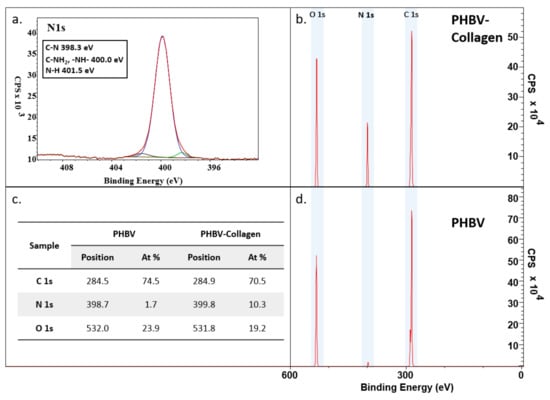 XPS analysis of PHBV and PHBV-Collagen fibre membranes: (a) a high-resolution view of the N 1s peak observed upon conjugation of collagen; (b) spectra for PHBV-Collagen; (c) table of peak binding energies and the percentage of elements present; and (d) spectra for PHBV.