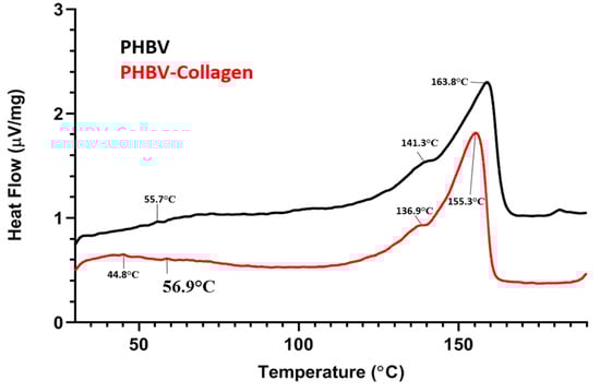 Figure 5 shows the DSC thermograms of both the conjugated and the unconjugated scaffolds, and the numerical data are summarised in the Table 1. Both thermograms displayed the characteristic twin peak of PHBV polymer melting behaviour, with a Tm (melting temperature) profile of PHB at 163.8 °C and PHV (polyhydroxyvalerate) at 141.3 °C. However, for the PHBV-Collagen fibres, a decrease of the typical PHBV melting temperature for both PHB and PHV melting peaks upon collagen conjugation was noticed, with a Tm of 155.3 °C for PHB and 136.9 °C for PHV. No great differences were detected for ΔHm (melting enthalpy) between PHBV and PHBV-collagen-melting enthalpies. Crystallisation temperature, as Tc peaks, were recorded at 55.7 and 56.9.6 °C in unconjugated (PHBV) and collagen-conjugated (PHBV-Collagen) samples, respectively. By introducing collagen as a surface bio-functionalisation, ΔHc (crystallisation enthalpy) slightly decreased from 0.182 to 0.120 µV s/mg. Collagen denaturation temperature was detected as a small peak at 44.8 °C for collagen-conjugated PHBV; this peak was not observed for pure PHBV scaffolds.