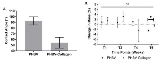 The change in the mass of the samples incubated in phosphate buffered saline (PBS) (pH 7.4) was monitored over a six-week period (intervals T0, T1, T2, T4, and T6 weeks). Analysis of the dry start and finish weights (Figure 6B) indicated that there was no statistically significant difference in the mass between time points (*ns) for both conjugated and unconjugated samples. However, by comparing both samples at the same time point (T), it was noticed that PHBV samples only showed a significant decrease in the mass against the PHBV-Collagen sample (*p < 0.05) at week 6 (T6).