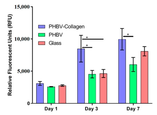 The relative metabolic activity of Neo-NHDF fibroblasts was measured using a Presto Blue assay (Figure 7). At day 1, no significant difference in metabolic activity was observed between samples. On days 3 and 7, cells seeded onto PHBV-Collagen scaffolds had significantly higher metabolic output than those on PHBV scaffolds. On day 3 PHBV-Collagen samples displayed significantly higher cell metabolic activity than in the glass samples, while on day 7, the difference in output was not significant.
