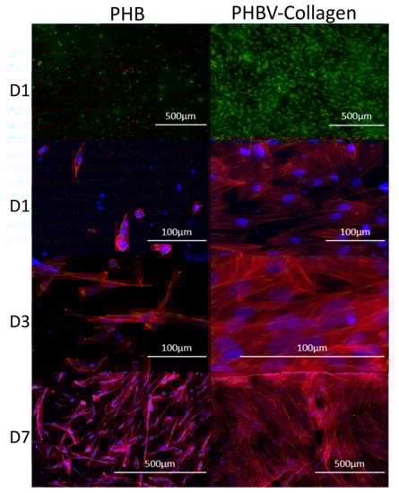 A key component in determining the viability of the scaffold is to observe the behaviour of the fibroblastic cells on the membranes. Collagen is a major constituent of the ECM, bearing the motifs to which cell integrins bind [], and as such, scaffolds conjugated with collagen displayed a much higher level of cellular growth and adhesion [,,]. A Live/Dead assay (Figure 8) on the same sample area showed a greater quantity of live cells on PHBV-Collagen than the PHBV surface. Cellular viability is a key indicator of biological success in living tissue, and thus an important aspect of assessing the efficacy of new materials for TE applications []. In this work, a greater number of viable cells growing on PHBV-Collagen conjugated substrates, with an increase in metabolic activity after day 3 was found (as shown in Figure 7). As the adhesion of cells to a surface is key in the mediation of multiple cell functions [,] (i.e., structural protein deposition, proliferation, migration, etc.), greater observed viability, mitochondrial activity, cell attachment, and spreading was observed in the presence of collagen motif-bearing conjugated membranes. Although not in collagen-grafted PHBV membranes, similar results were observed by the studies of Prabhakaran et al. using PC12 neural cells on electrospun PHBV nanofibers, where cell proliferation improved on the blended PHBV-Collagen nanofibers for nerve tissue engineering [].