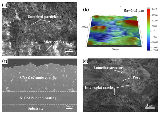 Figure 3. (a) Surface morphology, (b) surface roughness, (c) polished cross section, and (d) fracture microstructure of CYSZ ceramic coating in the plasma-sprayed specimen.