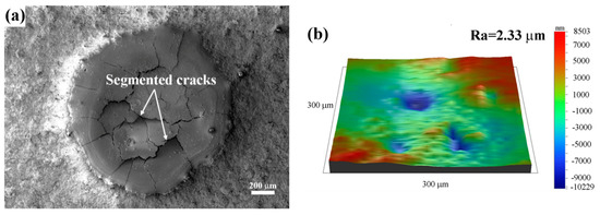 The surface morphologies of the dotted unit in the dotted specimens are presented in Figure 4. There are many segmented cracks on the coating surface after laser remelting, as shown in Figure 4a. The formed segmented cracks are mainly attributed to the molten pool with a small size, volume shrinkage, the release of residual stresses during the fast and uneven cooling of molten zirconia, and probably the large and regional temperature gradient [34]. Herein, the dot-like laser-remelted zone can be called as dotted unit. Meanwhile, the defects such as pores, protrusions, and unmelted and partially melted particles in the plasma-sprayed coatings were eliminated, and the surface of the dotted unit was much smoother. Therefore, the dotted unit had a low surface roughness of 2.33 μm (Figure 4b). Figure 4c demonstrates the high magnification surface morphology of the dotted unit. It can be seen that the surface of the dotted unit with fine grains is much denser. This is due to the complete recrystallization of CYSZ ceramic material after the ultrahigh laser heating and cooling.