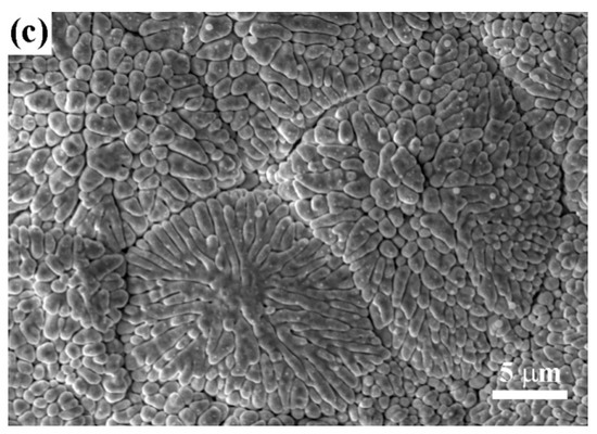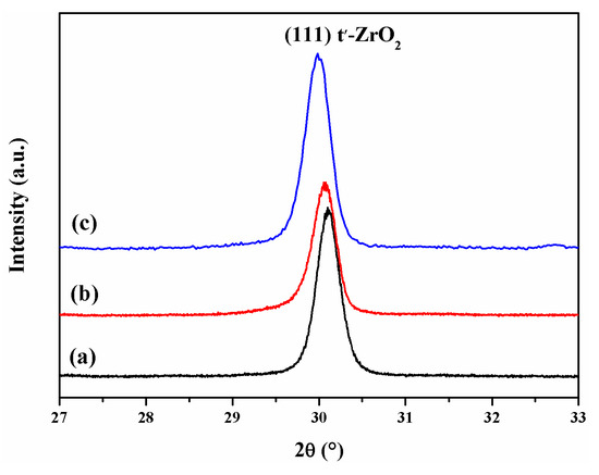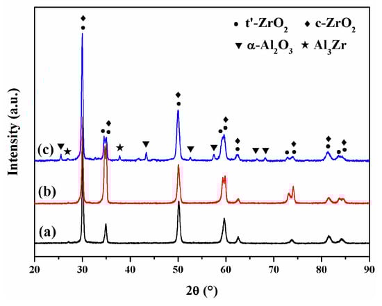 Figure 8 displays the XRD patterns obtained from the plasma-sprayed, dotted, and DA coatings at the 2θ range of 20°–90°. Both the plasma-sprayed and the dotted laser-remelted coatings showed the presence of the non-equilibrium tetragonal zirconia (t’-ZrO2) and cubic zirconia (c-ZrO2), as shown in Figure 8a,b. This is because of the rapid solidification after plasma spraying and laser remelting of CYSZ. Meanwhile, the dotted coating showed a higher peak intensity than the plasma-sprayed coating, which was mainly owing to the pseudo-columnar grain orientation induced by laser remelting. From Figure 8c, the phases of the DA coating were composed of t’-ZrO2, c-ZrO2, a small amount of α-Al2O3, and Al3Zr. The α-Al2O3 and Al3Zr phases were the results of the in-situ reaction of Al and ZrO2 at high temperatures [41,42]. No monoclinic zirconia (m-ZrO2) phase was detected in any coating at the 2θ range of 27°–33°, as shown in Figure 9. It was demonstrated that the harmful phase transformation of tetragonal zirconia (t-ZrO2) to m-ZrO2 was inhibited thanks to the extremely high cooling and solidification rate of plasma spraying and laser remelting. It is worth noting that the (111) diffraction peak showed a shift to a lower diffraction angle after selective laser remelting and Al deposition (Figure 9b,c), compared with the (111) diffraction peak in the plasma-sprayed coating (Figure 9a). According to Bragg’s law: