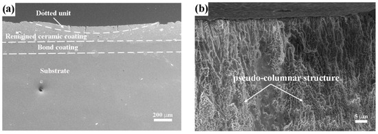 Figure 5 exhibits the cross-sectional morphologies of the dotted specimen. In the dotted specimen, the dotted unit, remained ceramic coating, and bondcoat were deposited on the superalloy substrate, as depicted in Figure 5a. The microstructure of the dotted unit was much denser than that of the remaining CYSZ ceramic coating. The dense dotted unit with vertical cracks had a thickness of approximately 70 μm. The induced thermal stress caused by the rapid cooling rate (106–108 K/s) and localized temperature gradient after laser treatment led to the formation of vertical cracks [49]. From Figure 5b, the fracture microstructure of the dotted unit presents a structure similar to a columnar structure, a pseudo-columnar structure, which was formed along the heat flow direction owing to the coupling effect of the temperature gradient and solidification rate in laser processing. In fact, it is a columnar structure composed of closely-linked partially melted particles, and a similar structure was also found by others [50].
