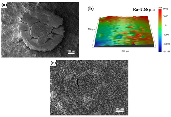 Figure 4. (a) Surface morphology, (b) surface roughness, and (c) high magnification surface micrograph of the dotted unit in the dotted specimen.