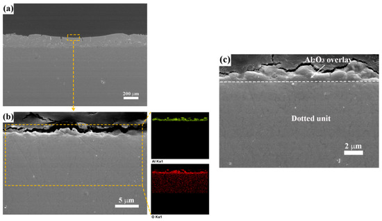 Figure 7 demonstrates the cross-sectional morphologies of the DA specimen. From Figure 7a, it can be seen that there was no obvious difference in the cross section of the dotted unit between the dotted specimen and the DA specimen. Figure 7b shows the upper layer of the dotted unit at high magnification and the corresponding elemental mapping analysis. It was observed that Al and O elements were plentiful in the surface layer of the dotted unit. This demonstrates the existence of Al2O3 in the DA specimen. Figure 7c shows the high magnification image of the Al2O3 overlay. It can be seen that the microstructure of the overlay was dense and the thickness of the Al2O3 overlay was about 1–2 μm.