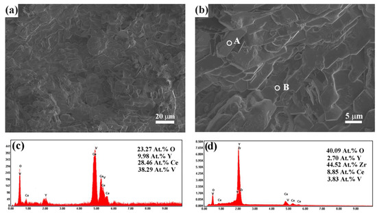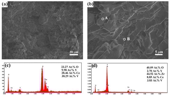 Figure 10 exhibits the surface morphologies of the plasma-sprayed coating after 30 h hot corrosion. The appearance of the plasma-sprayed coating was almost covered with plate-shaped crystals, indicating the presence of corrosion reactions between the molten salts and the CYSZ coating, as depicted in Figure 10a. Figure 10b shows the corrosion products of the plasma-sprayed coating at higher magnification. As can be seen, there were many plate-shaped crystals stacked on top of each other and a few particle-shaped crystals. Their compositions were confirmed by EDS analysis, as shown in Figure 10c,d. Figure 10c demonstrates that the plate-type crystals (Spot A) consisted of O, Y, Ce, and V elements. Figure 10d demonstrates that particle shaped crystals (Spot B) mainly contained O, Zr, and Ce elements.