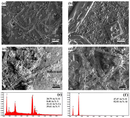 Figure 12 demonstrates the SEM surface morphologies of the DA coating after the hot corrosion test. In contrast, these long plate-shaped crystals were scarce on the surface of the dotted unit, which were replaced by short plate-shaped crystals (Figure 12a,b). This indicates that the dense α-Al2O3 overlay can effectively inhibit the reaction between molten salts and CYSZ coating. From Figure 12c, the hot corrosion behavior on both sides of the boundary of the dotted unit was obviously different. The long plate-shaped crystals outside the dotted unit extended to the dotted unit. Although the plasma-sprayed zone was also modified by Al deposition, there were still many long plate-shaped crystals distributed on it, as shown in Figure 12d. Compared with the plasma-sprayed coating without Al modification (Figure 10), the plasma-sprayed zone modified by Al deposition was not fully covered with plate-shaped crystals. This demonstrates that Al deposition was also beneficial to the hot corrosion resistance of the plasma-sprayed zone. Figure 12e indicates that the plate-type crystals (Spot E) consisted of O, Y, Ce, and V elements. Figure 12f demonstrates that particle shaped crystals (Spot F) mainly contained O and Al elements.