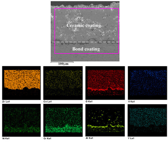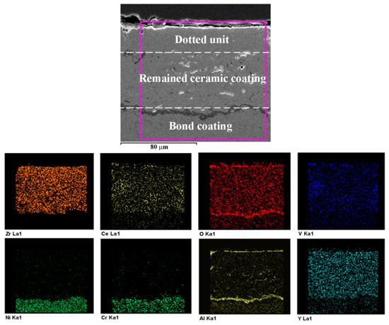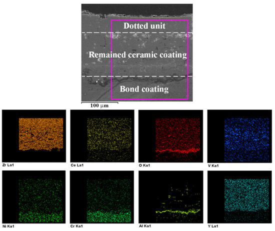 The EDS elemental mapping of the cross section of the plasma-sprayed specimen after hot corrosion test is given in Figure 13. It can be seen that vanadium element was mainly distributed in the surface layer. This reveals that the molten salts can easily infiltrate into the CYSZ coating through the defects such as pores, voids, and microcracks in the plasma-sprayed coating. However, aluminum and oxygen elements existed not only in the voids of the CYSZ ceramic coating, but also at the interface between the topcoat and the bondcoat. The third layer between topcoat and bondcoat is the thermally grown oxide (TGO) and is a result of oxygen diffusion through the ceramic coating towards the bondcoat and the oxidation of metallic bondcoat [51,52]. Table 4 lists the total elemental composition of the plasma-sprayed coating after the hot corrosion test. It is evident that the content of O and V was higher, which signifies the poor hot corrosion resistance of the plasma-sprayed coating. The EDS elemental mapping and total elemental composition of the cross section of the dotted unit in the dotted specimen after the hot corrosion test are shown in Figure 14 and Table 4, respectively. We can see that the oxygen and vanadium elements were few in the dense dotted units. This confirms that the dense dotted units can suppress the penetration of molten salts into the CYSZ ceramic coating. The EDS elemental mapping of the cross section of the dotted unit in the DA specimen after the hot corrosion test is shown in Figure 15. It is observed that there were aluminum and oxygen elements on the surface of the dotted unit after the hot corrosion test. The relatively dense overlay was the in-situ synthesized α-Al2O3, which led to the relatively high content of aluminum and oxygen elements in the DA coating as shown in Table 4. Above all, the cerium, yttrium, and vanadium elements were fewer in the ceramic coating of the DA specimen. Therefore, the dense α-Al2O3 layer and laser remelted units effectively inhibited the infiltration of molten salts into the CYSZ ceramic coating, leading to the optimal hot corrosion resistance of the DA specimen.