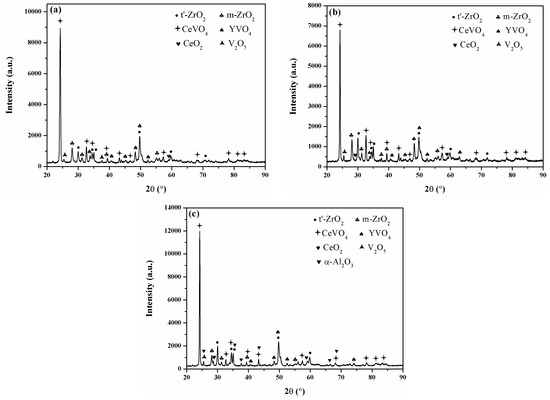 Park et al. [56] found that pure CeO2 precipitates were formed owing to mineralization of the CeO2 stabilizer in CYSZ coating in the course of the hot corrosion test. This is why the free CeO2 was detected in the XRD patterns of all coatings after the hot corrosion test (Figure 16). Both the free CeO2 precipitates and CeO2 stabilizers in zirconia could react with the V2O5 to generate the CeVO4 [57].