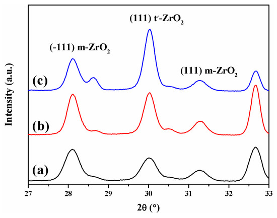 Figure 9. XRD patterns of (a) plasma-sprayed, (b) dotted, and (c) DA coatings before the hot corrosion test at the 2θ range of 27°–33°.