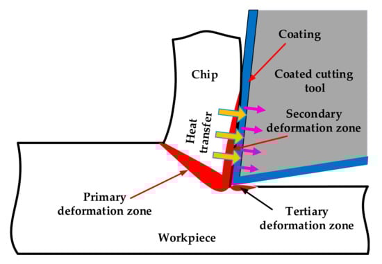 Metal cutting studies in terms of thermal aspects have focused on determining the cutting heat generation and cutting heat conduction. During the metal cutting process, cutting heat is mainly generated in three regions, as shown in Figure 1. The cutting temperature of the cutting tool is mainly influenced by the heat generated in primary deformation and secondary deformation zones [8]. The coefficient of friction (COF) between the tool rake face and chip impacts the heat produced in the secondary deformation zone [9,10]. Tool-chip contact conditions and cutting tool thermal-physical properties affect the heat conduction from the chip into the cutting tool [11,12,13,14,15].