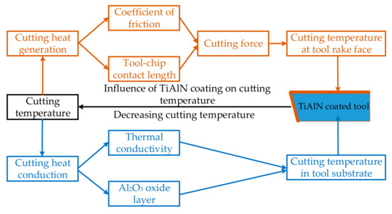 TiAlN coated tools have become a recent hotbed of discussion within the metal cutting field. Both economical and environmental factors drive manufacturers to search for ways to avoid environmental pollution and high production costs. Thus, the application of hard coatings became popular in factories, especially TiAlN coating. Due to their excellent properties, TiAlN coated tools are often utilized in metal cutting processes under dry cutting conditions [1,2,3,4]. The use of TiAlN coated cutting tools improves productivity and extends cutting tool life, compared with traditional cemented carbide tools in metal cutting process [5,6]. However, the high cutting temperature is still the main restraining factor for the application of TiAlN coated tools in the metal cutting process [7].