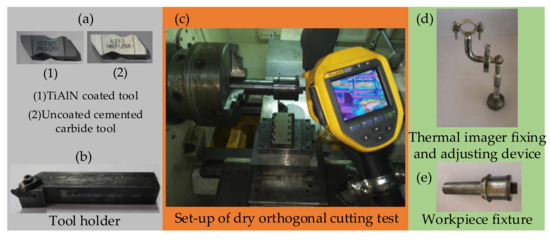 The experimental set-up for the dry orthogonal cutting tests is shown in Figure 3. The cutting tests were carried out on a computer numerical control (CNC) lathe machine (CKD6150H, Dezhou PuLiSen Machine Tool Co. Ltd., Dezhou, China). This CNC turning center was equipped with a spindle power of 7.5 kW and a maximum spindle speed of 1600 rpm.