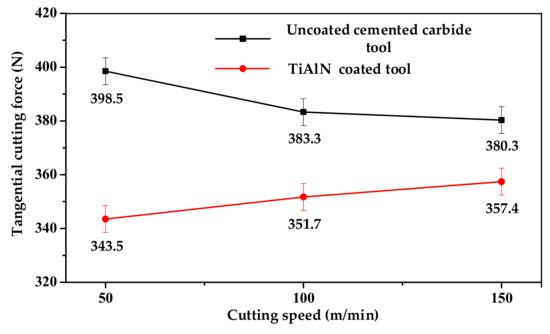 The TiAlN coated and uncoated cemented carbide tools share the same cutting parameters. Three different cutting speeds (50, 100, and 150 m/min) were selected. Undeformed chip thickness and cut width were kept constant at 0.015 and 2 mm, respectively.