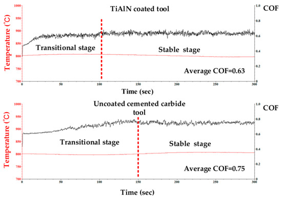 The tangential cutting force of TiAlN coated tools was smaller than that of uncoated tools. This could be attributed to two reasons. On the one hand, TiAlN coating could reduce the friction between the tool rake face and the chip. On the other hand, the coating was helpful to shorten the contact length between the coated tool and the chip. The values of the COF between tool rake face and H13 hardened steel material at 800 °C are exhibited in Figure 6.