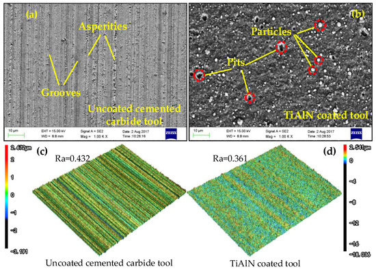 For the TiAlN coated tool, it took 102 s to reach the stable stage in the friction tests. Meanwhile, it took 150 s for the uncoated cemented carbide tool to reach the stable stage. The TiAlN coated tool reached the stable stage more quickly because its rake face roughness was superior to the cemented carbide tool rake face roughness. The rake face topographies and the surface roughness of the two kinds of cutting tools were presented respectively in Figure 7. The asperities and grooves appeared at the uncoated cemented carbide tool rake face. At the same time, only some particles and pits appeared on the TiAlN coated tool rake face. As shown in Figure 7c,d, the surface roughness of uncoated cemented carbide and TiAlN coated tool were 0.432 and 0.361, respectively.