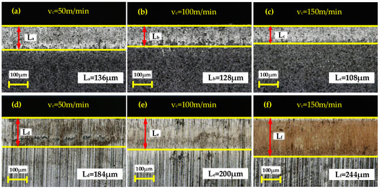 Variation of tool-chip contact length at tool rake face with cutting speeds, (a–c): TiAlN coated tool; (d–f): uncoated cemented carbide tool.