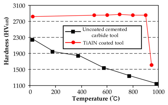 Hardness of TiAlN coated and uncoated tools at various temperatures. Reprinted with permission from ref. [30]. Copyright 2007. Elsevier.