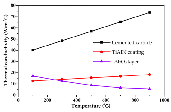 Due to lower thermal conductivity, the TiAlN coating impeded the cutting heat from conducting into the cutting tool. Furthermore, the Al2O3 oxide layer generated at the tool rake face also hindered the cutting heat from entering the cutting tool. Figure 10 illustrates the decreased thermal conductivity of the Al2O3 coating layer with the increase of temperature. The thermal conductivity of Al2O3 coating layer fell from 17 W/m·°C at 100 °C to 5.5 W/m·°C at 900 °C. Lower thermal conductivity resulted in less cutting heat being conducted into the cutting tool. Therefore, both the Al2O3 oxide layer and the TiAlN coating acted as thermal barriers during cutting heat conducting from the tool rake face into the cutting tool substrate. They guaranteed that the TiAlN coated tool maintained a lower cutting temperature and better hardness during the metal machining process.