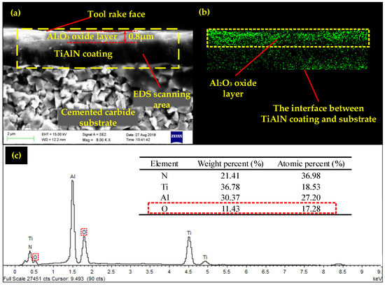 An Al2O3 oxide layer was generated at the TiAlN coated tool rake face during the metal cutting process in this study. Figure 11 exhibits the fracture surface morphology of TiAlN coated tool at the tool-chip contact area at the cutting speed of 50 m/min. It also displays the results of elemental scanning of the cross-section area. Figure 11a demonstrates that the thickness of Al2O3 oxide layer was 0.8 μm. The elemental scanning result shown the oxygen distributed on the top surface of TiAlN coating was significantly larger than that on the substrate of the coating as displayed in Figure 11b. The oxygen element weight percentage and the atomic percentage were revealed by Figure 11c. The values of these percentages were 11.43% and 17.28%, respectively. This further proved the existence of the oxide layer.