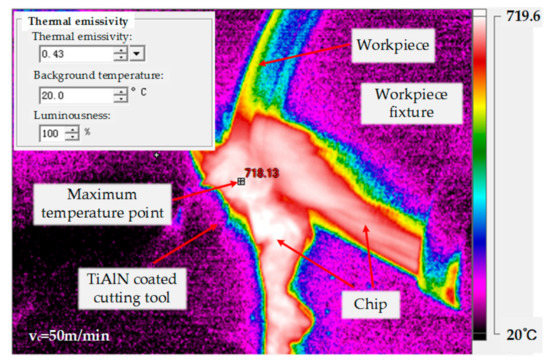 The cutting temperature at the tool-chip contact zone was measured by infrared radiation (IR) thermal imager Ti400 (FLUKE, Everett, WA, USA). An IR thermal imager was mounted at the turning lathe through a designed fixture as shown in Figure 3d. The fixture allowed IR thermal imager to move with any height and angle. IR thermal imager moves with the cutting tool and ensures the measurement area remained unchanged with the aid of the fixture. The temperature measurement system provided for an automatic atmospheric transmission correction of temperature based on input distance from the object, atmospheric temperature and relative humidity. The captured images were analyzed by the SmartView analysis software (version, 3.10, FLUKE, Everett, WA, USA). The cutting temperature at the cutting tool substrate was recorded by K type thermocouple with 0.5 mm diameter. Thermocouple was embedded in the fixed position of cutting tool substrate.