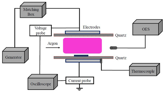 A RF Generator (13.56 MHz, RF-10S/PWT, Advanced Energy, Fort Collins, CO, USA) was used as power source in plasma annealing. The discharge chamber was made by quartz and the chamber wall is 1 mm thick. The discharge gap is 2 mm. The films have been treated separately at three discharge power: 40, 60 and 80 W. Ar with the flow rate of 500 sccm was used as the treatment gas. The treatment time is 30 min. The waveforms of applied voltage and discharge current were measured by wideband voltage probes (Tektronix P5100, Beaverton, OR, USA) and wideband current probes (Pearson 2877, London, UK), and recorded on a digital oscilloscope (Tektronix DPO 4101). Optical emission spectra of the RF plasma were investigated by an optical emission spectrometry (OES, Avantes Avaspec-2048tec, Apeldoorn, The Netherlands). The schematic of the experimental setup is shown in Figure 1.