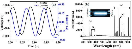 (a) Voltage and current waveforms of argon RF discharge of 80 W; (b) OES spectrum of argon RF discharge.