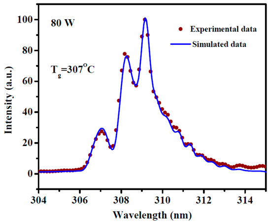 The OH (309 nm) rotational temperature are usually used to estimate the gas temperature of plasma (Tg) [23]. By using LIFBASE software (version 2.1.1), the OH rotational temperatures at discharge were simulated and the result at 80 W is shown in Figure 3. The simulated result show that the gas temperature was 307 °C. The gas temperature simulated with OH peak by OES (To) at discharge power of 40 and 60 W are 207 and 277 °C and shown in Table 2.