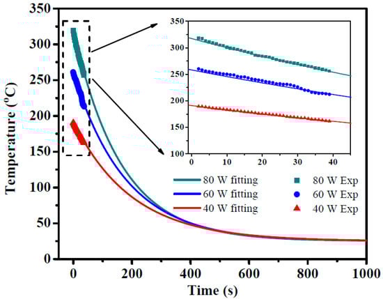 Newton’s law of cooling demonstrates exponential cooling curve with time [24]. The electrode temperature changes with time are recorded and shown in Figure 4 until the temperature stabiles. The temperature changes from the beginning 2–39 s were inset in Figure 4 and fitted with Newton’s law of cooling. We got the formula as follows,