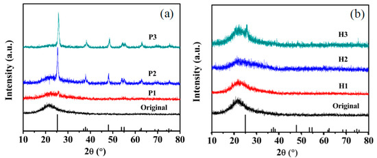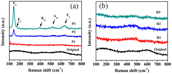 Raman shift spectra were performed and the results are shown in Figure 6. As shown in Figure 6a, original sample and P1 are amorphous. And P2 and P3 show anatase TiO2 major Raman bands at 144, 197, 399, 515, and 639 cm−1. These bands can be attributed to the five Raman-active modes of anatase phase corresponding to Eg, Eg, A1g, B1g, and Eg, respectively [25]. Figure 6b shows the Raman shift spectra of the samples with a different heating treatment. All the samples are amorphous. The Raman results are in well agreement with the above XRD results.