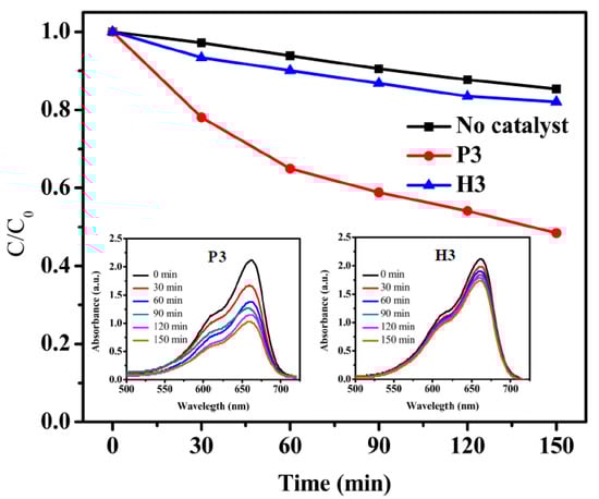 Results of the photocatalytic degradation of MB under UV irradiation by P3 and H3.