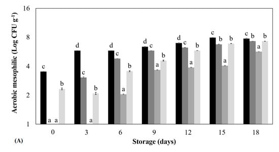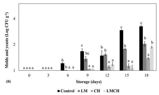 Growth of (A) aerobic mesophilic microorganisms (total aerobic counts) and (B) molds and yeasts in fresh-cut cantaloupe with and without an edible coating (control) during 18 days of storage at 4 °C. Means which do not have a common letter (a, b, c) are significantly different (p ≤ 0.05). Vertical bars represent ± SD. LM: linseed mucilage; CH: chitosan; LMCH: linseed mucilage + chitosan.