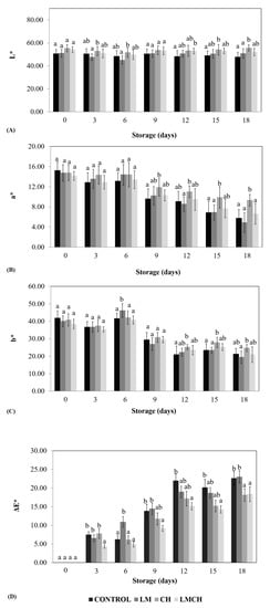 Color attributes—(A) L*, (B) a*, (C) b*, and (D) ΔE*—of fresh-cut cantaloupe with and without an edible coating (control) during 18 days of storage at 4 °C. Means which do not have a common letter (a, b, c) are significantly different (p ≤ 0.05). Vertical bars represent ± SD.