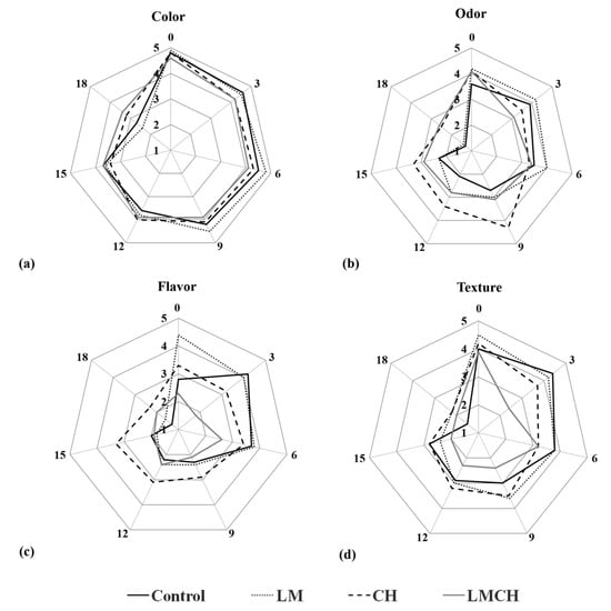Secondly, a decrease (p < 0.05) was found in the odor values during storage time in all treatments. However, a significant preference was found (p < 0.05) with respect to the fruit coated with CH (4.30–2.50) and LMCH (3.10–2.60) between days 9 and 18 relative to the fruit treated with LM (3.00–1.40) and the control (2.70–1.30, Figure 3b). Undesirable changes in the aroma of fresh-cut cantaloupe might be associated with variations in the concentration of volatile compounds specific to fruit metabolism (e.g., acetate and nonacetate esters, aldehydes, and sulfur-containing compounds) [,], coupled with unpleasant “fermented” odors associated with microbial spoilage. These results are consistent with the findings of our microbial analysis (Figure 1) and agree with the findings of Martiñón et al. [].