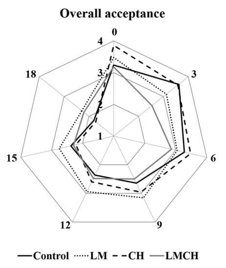 For the overall sensory acceptance, due to its organoleptic characteristics, CH- and LM-coated fresh-cut cantaloupe was accepted for 12–15 days (Figure 5 and Figure 6). Also, although LMCH-coated samples helped to preserve the properties of color, odor, texture, and decay rate, the overall sensory acceptance was similar to the control fruit (up to 9 days) due to the change in flavor detected by the panelists (Figure 3, Figure 5 and Figure 6).